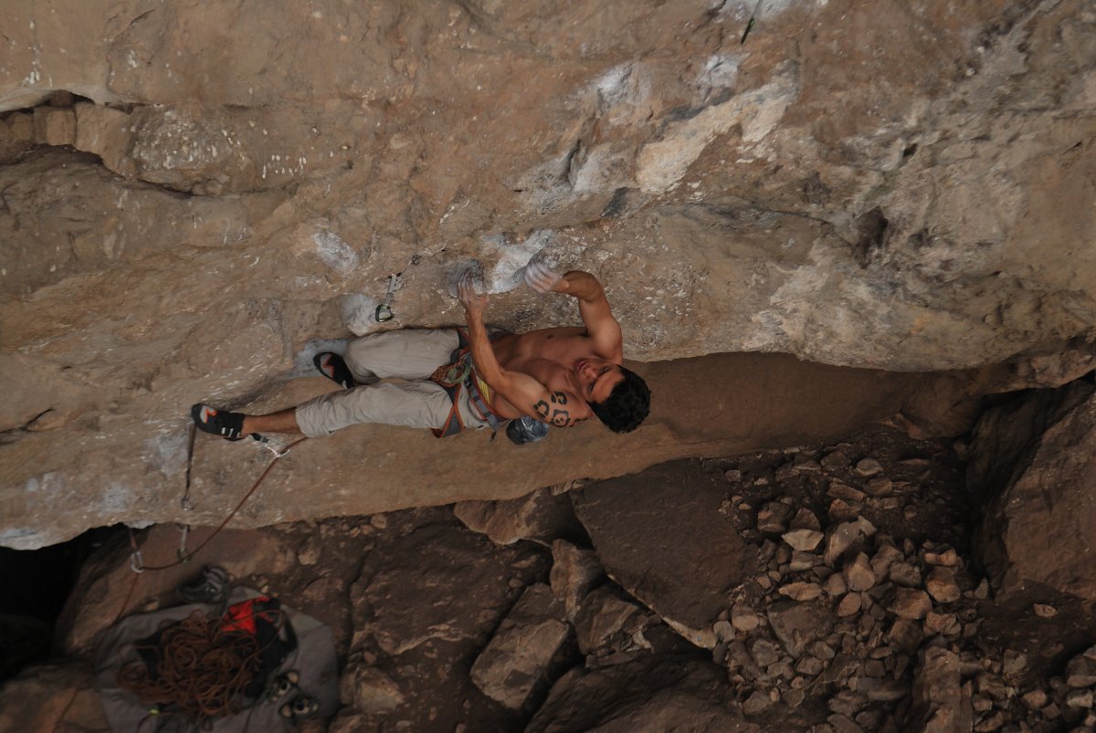 This is a sweet line with very good rests, huge holds but a killer 30 meters long! So you better have a good cardio if you want to try it! The bottom half is an easy but scary slab that finishes in a very good rest heading to a roof crux with powerful moves between stalagtites and pockety holds to follow into a good rest and from there keep on moving into pumpy climbing. Fer dialed this sequence in quickly and sent this bad boy in 4 goes!!